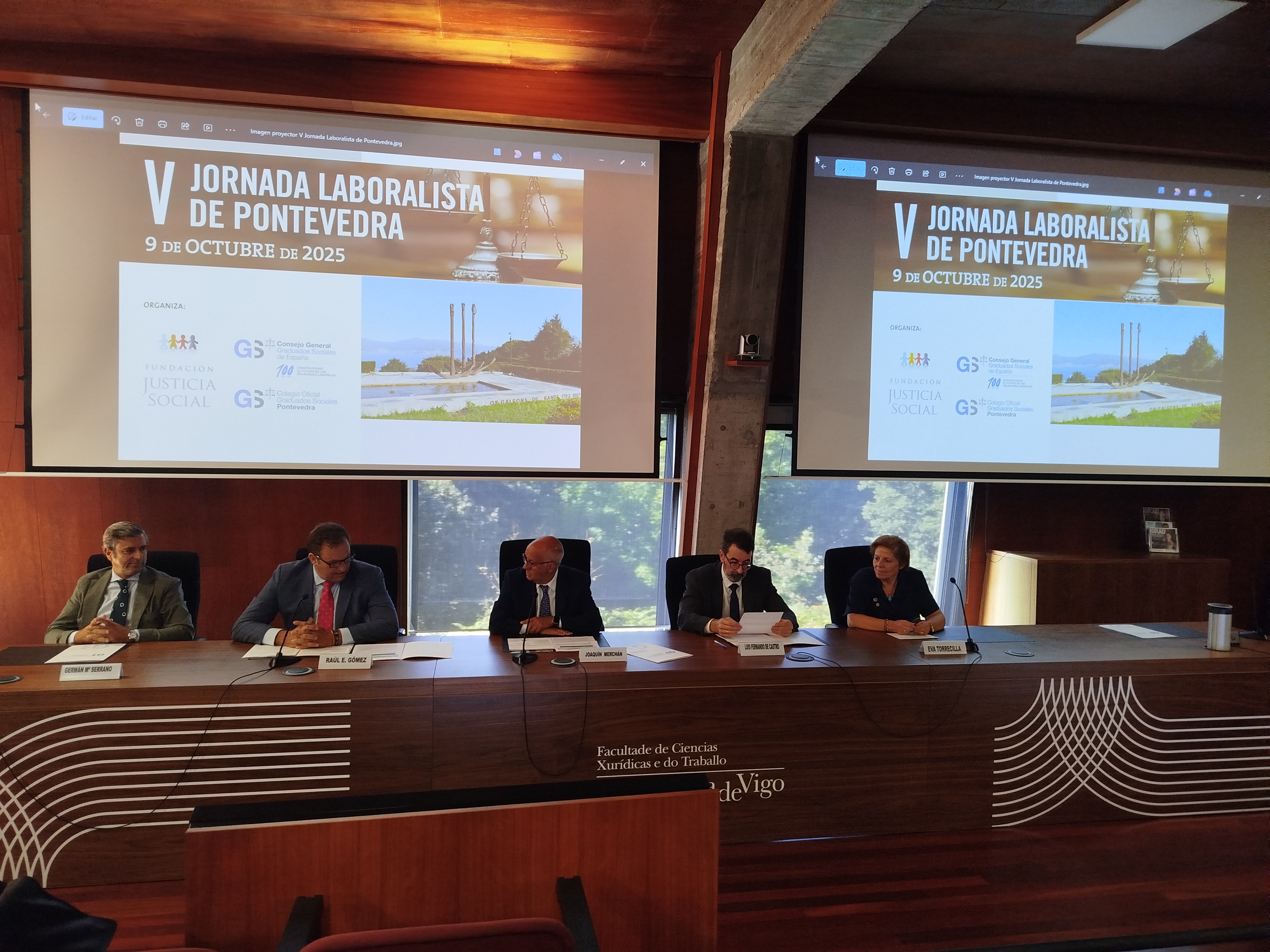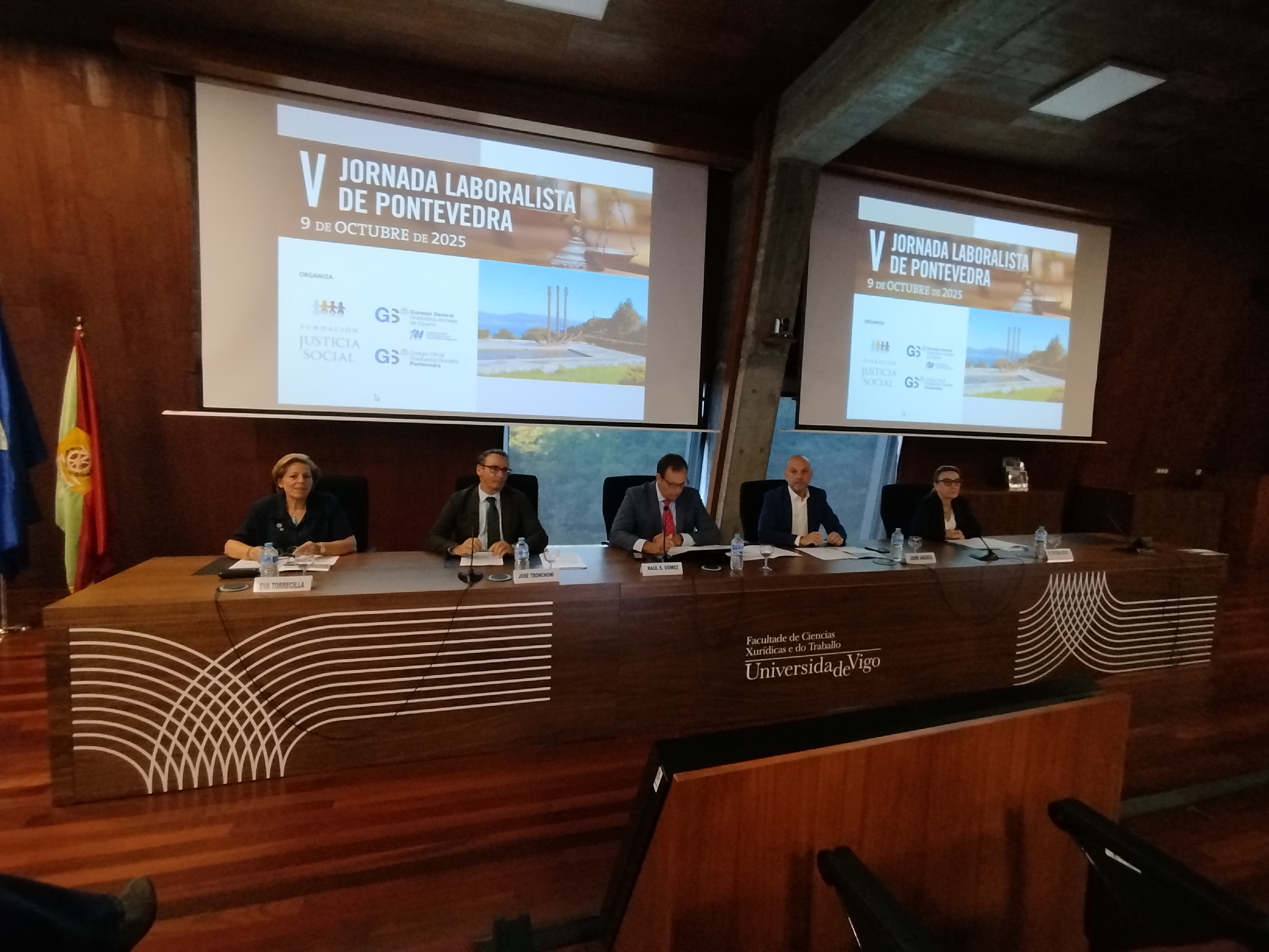 La mesa del acto inaugural estuvo integrada por Dª. María Antonia Arias Martínez, Vicedecana de Derecho y Coordinadora del Grado de la Facultad de Ciencias Jurídicas y del Trabajo en la Universidad de Vigo; Dª. Eva Torrecilla Hernández, Directora de la Fundación Justicia Social; D. José Tronchoni Albert, Director General de Justicia de la Xunta de Galicia; D. Jaime Aneiros Pereira, Concejal Ayuntamiento de Vigo y D. Raúl Eugenio Gómez Villaverde, Presidente del Colegio Oficial de Graduados Sociales de Pontevedra
