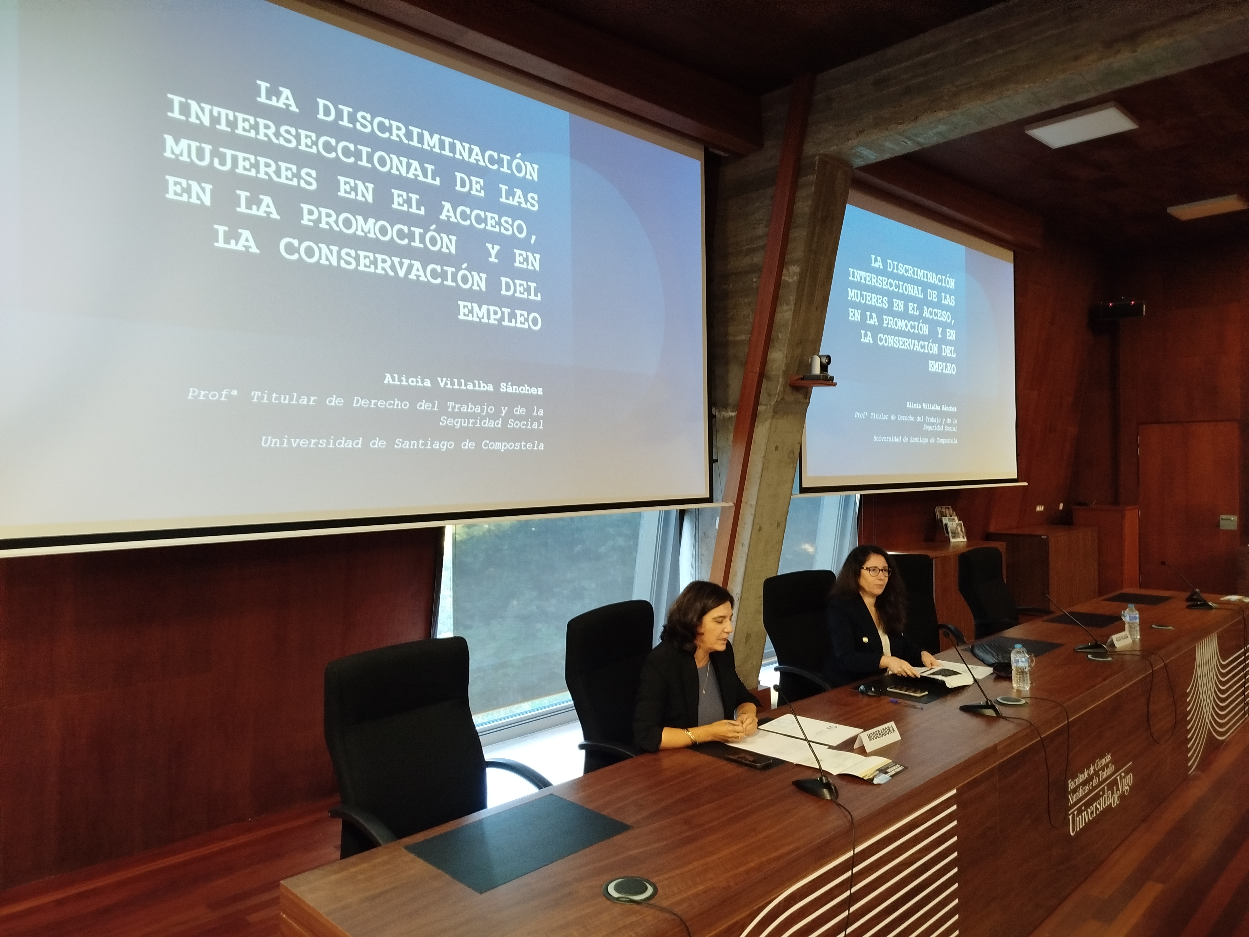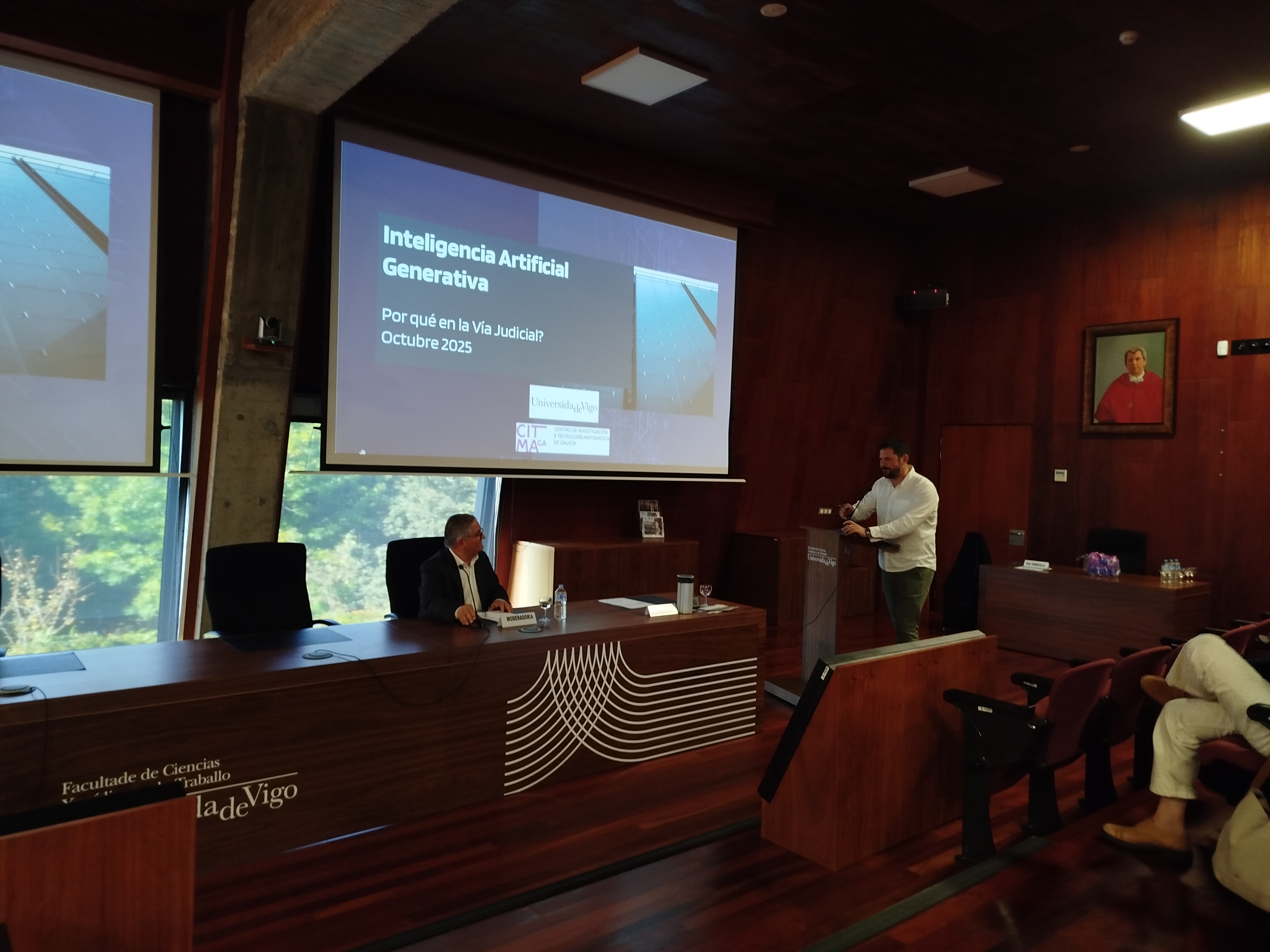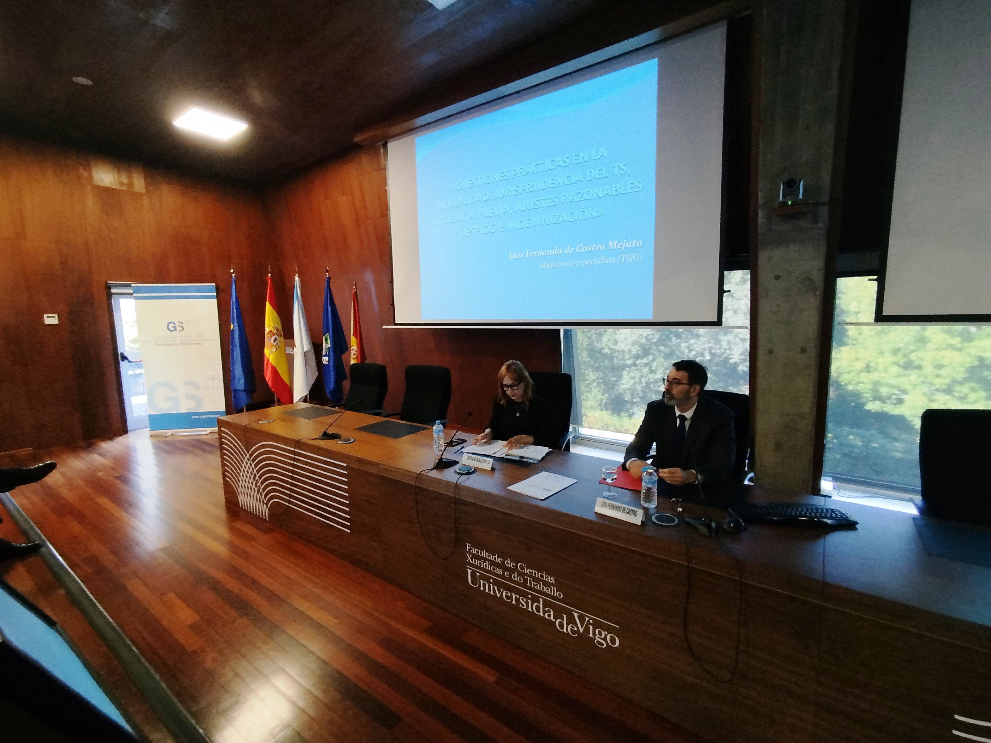 El acto contó con la participación de destacados ponentes, que abordaron temas de gran relevancia: “LA DISCRIMINACIÓN INTERSECCIONAL DE LA MUJER EN EL ACCESO, PROMOCIÓN Y CONSERVACIÓN DEL EMPLEO”, a cargo de Dª Alicia Villalba Sánchez, Profesora Titular de Derecho del Trabajo y Seguridad Social de la Universidad de Santiago de Compostela; “CUESTIONES PRÁCTICAS EN LA ACTUALIDAD. JURISPRUDENCIA DEL TS, AUDIENCIA PREVIA, AJUSTES RAZONABLES Y DESPIDO E INDEMNIZACIÓN” a cargo de D. Luis Fernando de Castro Mejuto, Presidente de la Sala de lo Social del Tribunal Superior de Justicia de Galicia; “INTELIGENCIA ARTIFICIAL, SU INFLUENCIA EN LA VÍA JUDICIAL” teniendo como ponente a D. Javier Martínez Torres, Profesor titular del departamento de Matemática Aplicada I de la Universidad de Vigo.